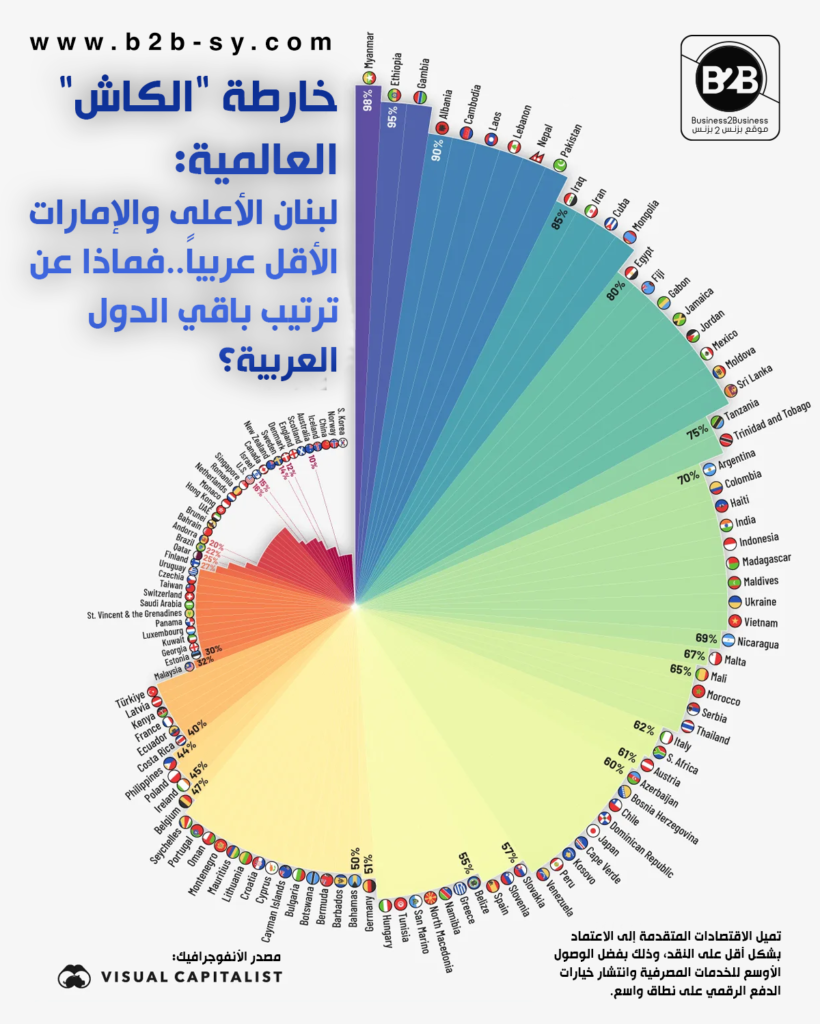 وفقاً للبيانات الواردة، تظهر الدول العربية بنسب اعتماد متفاوتة على النقد في معاملاتها اليومية كالتالي:
